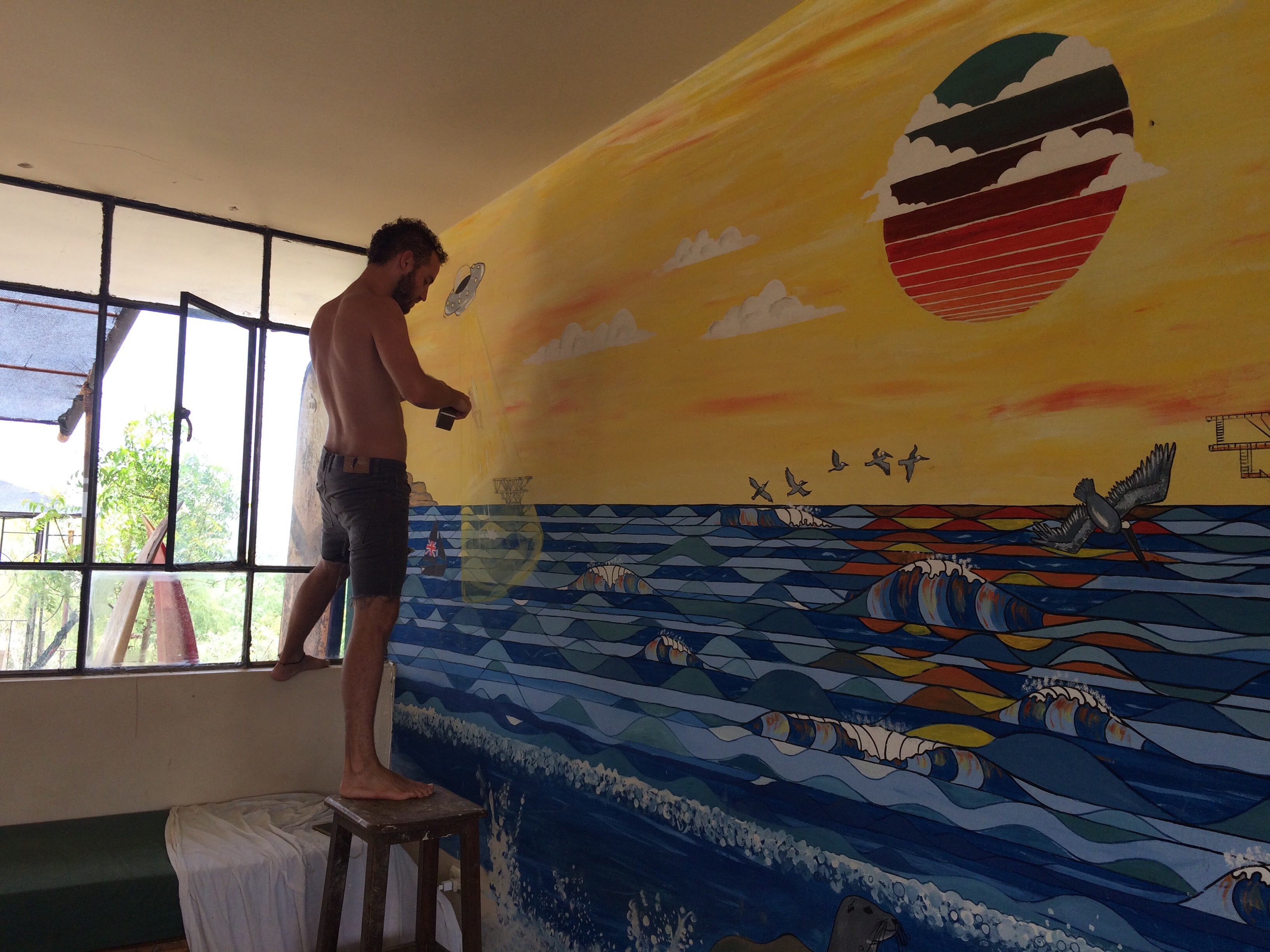 I mentioned before I came here that I paint. There was another friend named Mauro who is an architect. Our boss asked us to create a mural on a wall. There was a huge painting at the entrance of the hostel, but he didn’t like it and wanted it replaced. I had always wanted to do some painting during my journey, so I was really happy to finally get the chance. I’d much rather paint than clean bathrooms. We planned to design something new and spend the day painting.