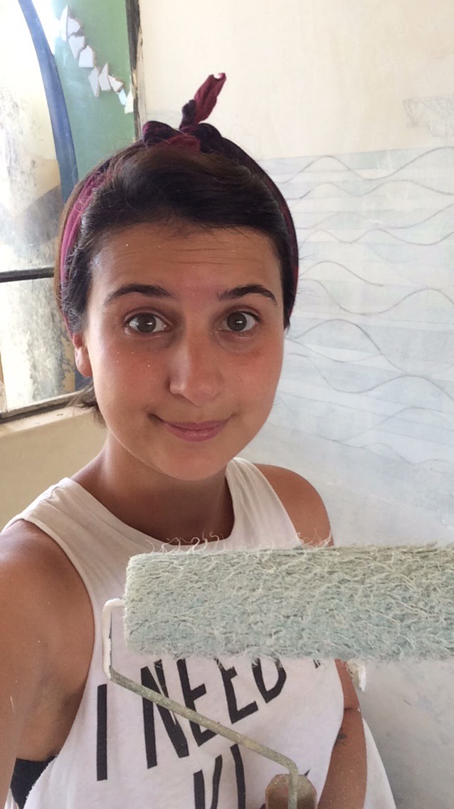 Ben gelmeden önce resim yaptığımı söylemiştim. Gönüllülerden bir arkadaş Mauro da mimar çıktı. Patron da bizden bir duvar resmi yapmamızı istedi. Girişte kocaman bir resim zaten vardı ama tasarımı artık sevmediği için değiştirmemizi istiyordu. Yola çıktığımdan beri zaten resim üstüne bir şey yapmak istiyordum. O yüzden bu teklifi alınca aşırı mutlu oldum. Tuvalet temizlemek, çarşaf sermek yoktu. Ortak bir tasarım yapıp tüm gün resim yapacaktık.