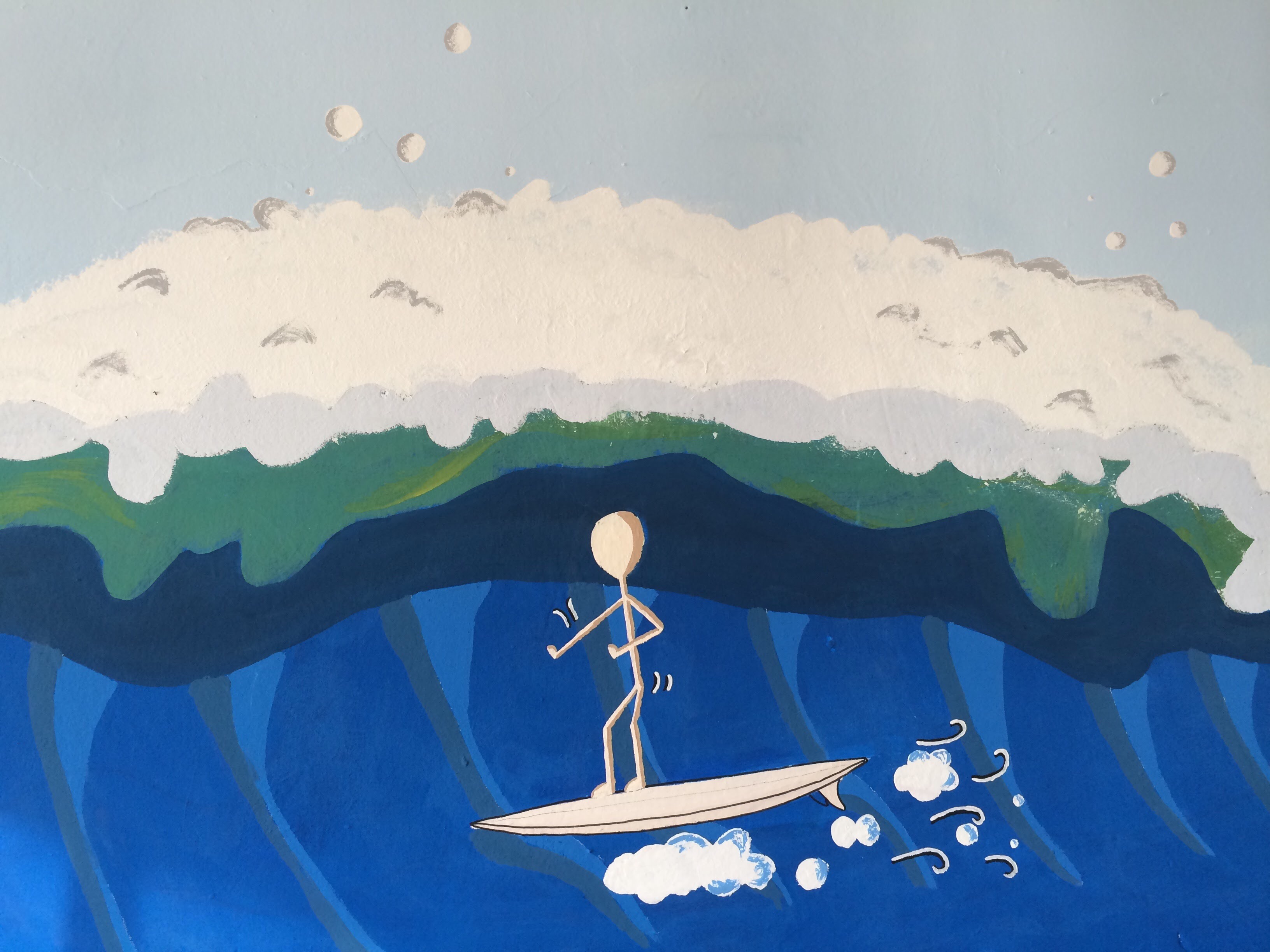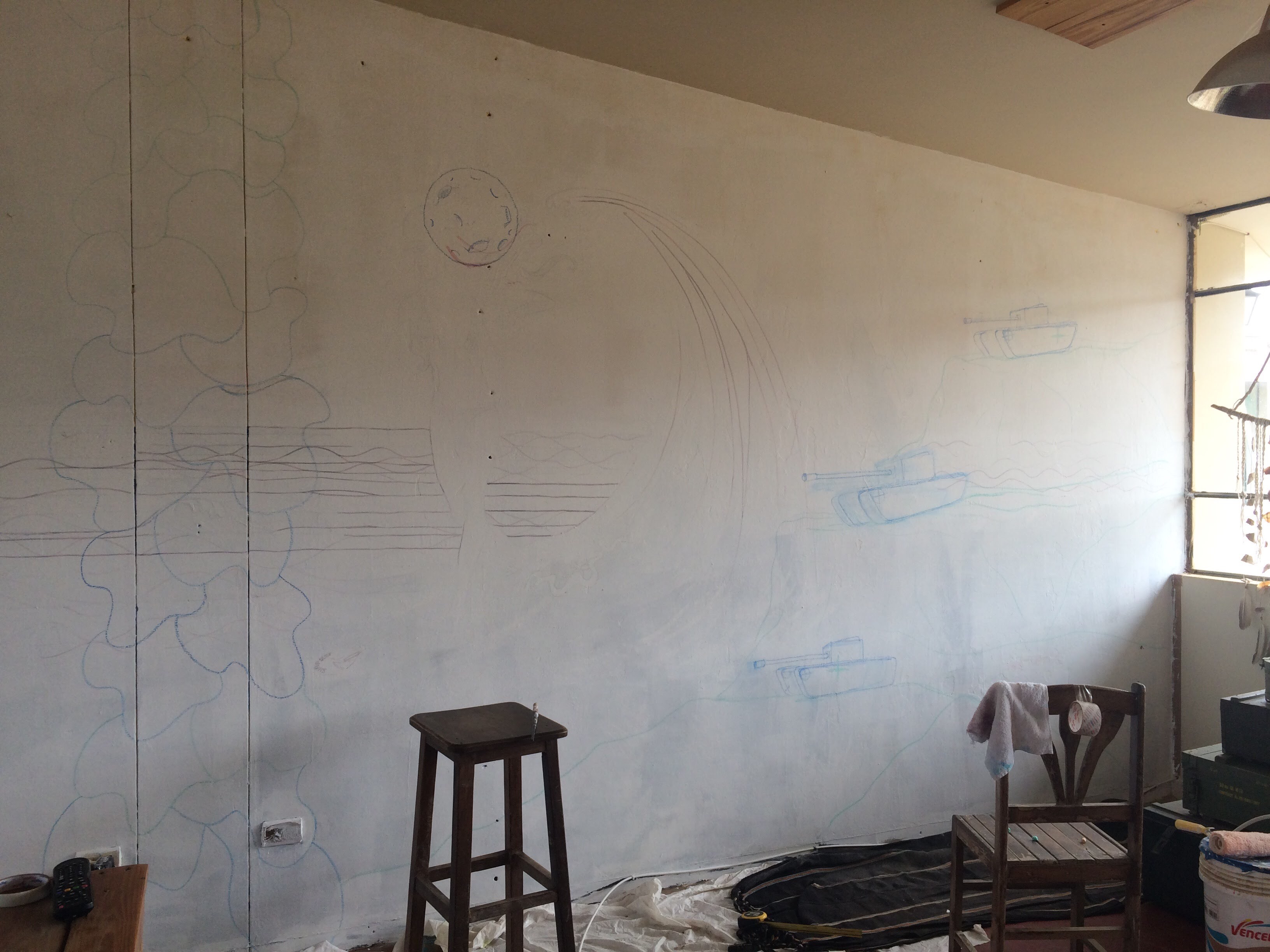 Since the hostel was in a former military area but now a surfing hostel, he wanted us to design something reflecting both themes. So we came up with a design of tanks shooting surfers at night and surfers arriving in the morning to catch the waves. We had to paint the wall white twice to cover the old mural before we could start.