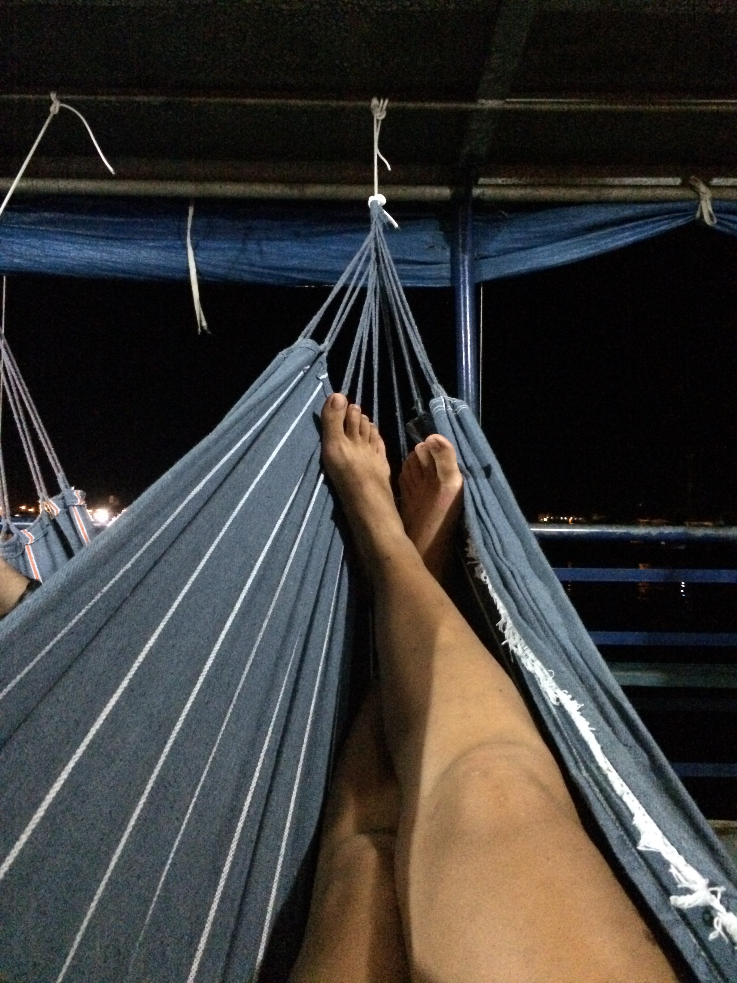 We went back to the ship. We came across the couple that asked us questions. They decided to take this ship. They set their hammocks next to us. Then a few foreign came and set their hammocks near us, too. We are like a gringo team. We put our backpacks under the hammock. We kept our valuable stuff in our little bags. We will sleep with them, like hugging. Because on these ships, burglary is very common. Especially if you are a foreign.